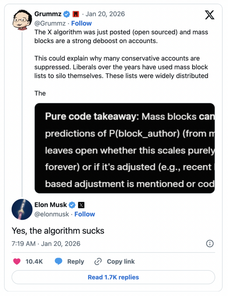 Le code détecte les cercles de réponses artificiels et applique une dévaluation. X cherche des réponses organiques provenant de clusters différents. Une réponse courte type emoji a désormais un poids proche de zéro.