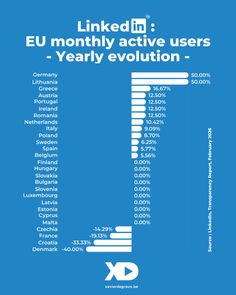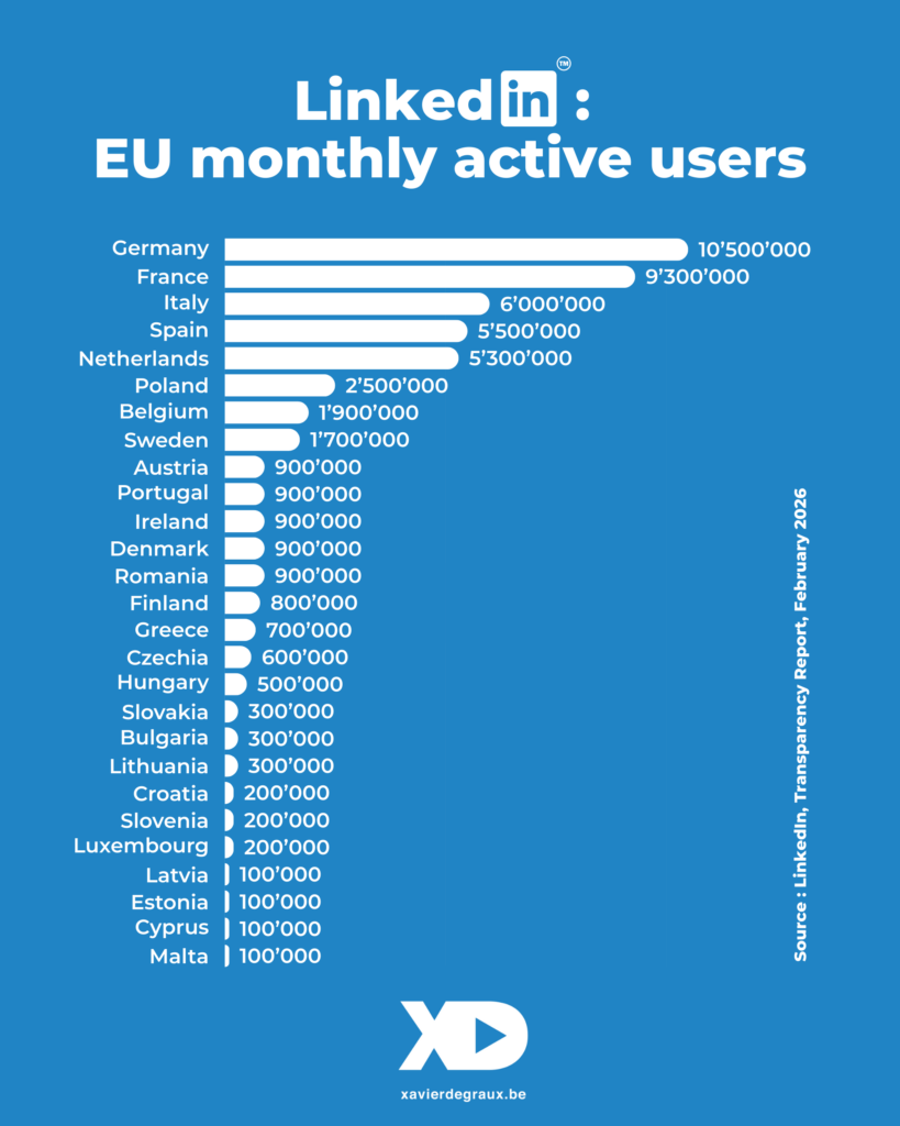 LinkedIn vient de publier son 6ème rapport de transparence dans le cadre du DSA. Entre purges massives d’utilisateurs en France et explosion statistique en Allemagne, les nouveaux chiffres imposés par Bruxelles redessinent la carte de LinkedIn en Europe. Analyse d’un séisme statistique qui confirme, au passage, la maturité du marché belge.