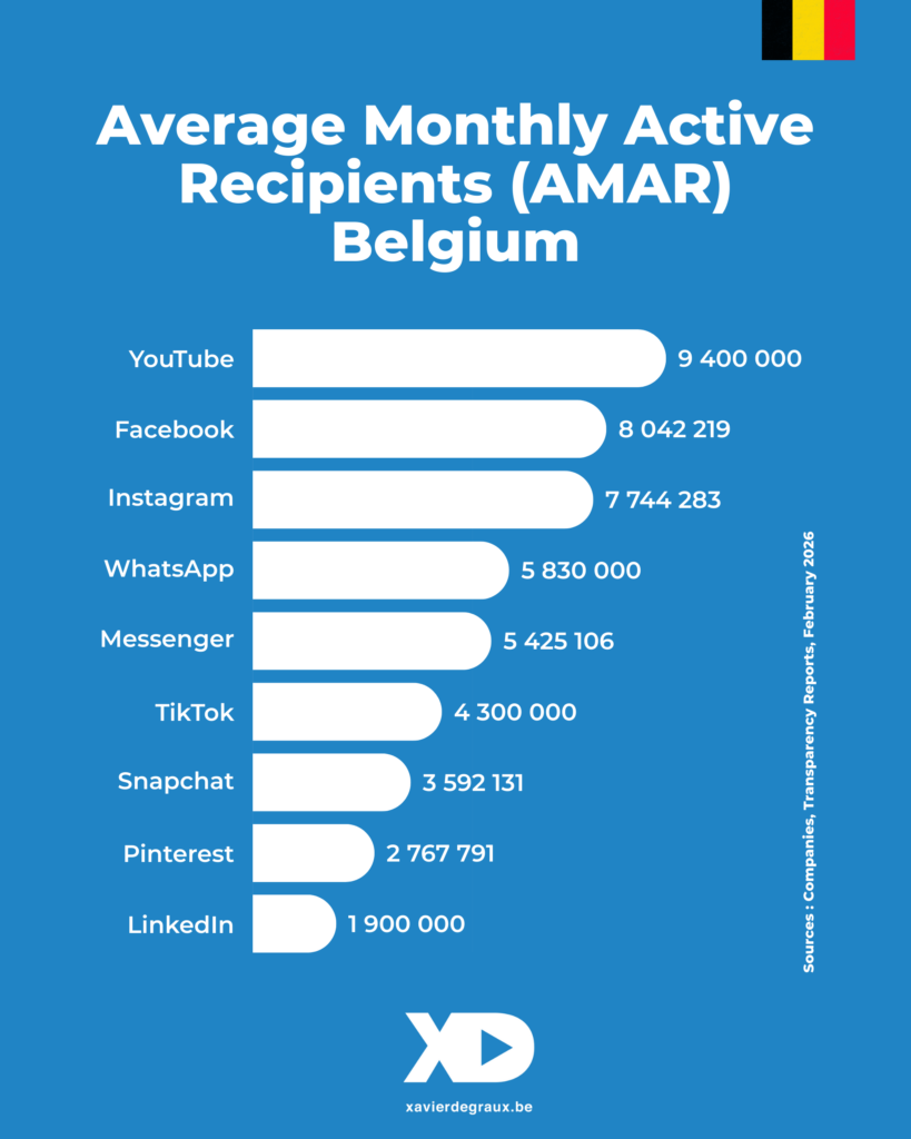 Et en Belgique, les 9,4 millions de récipiendaires actifs de YouTube pèsent 4,9 fois plus que le 1,9 million de récipiendaires sur LinkedIn, alors que les taux de pénétration de Whatsapp et de Messenger sont particulièrement élevés.