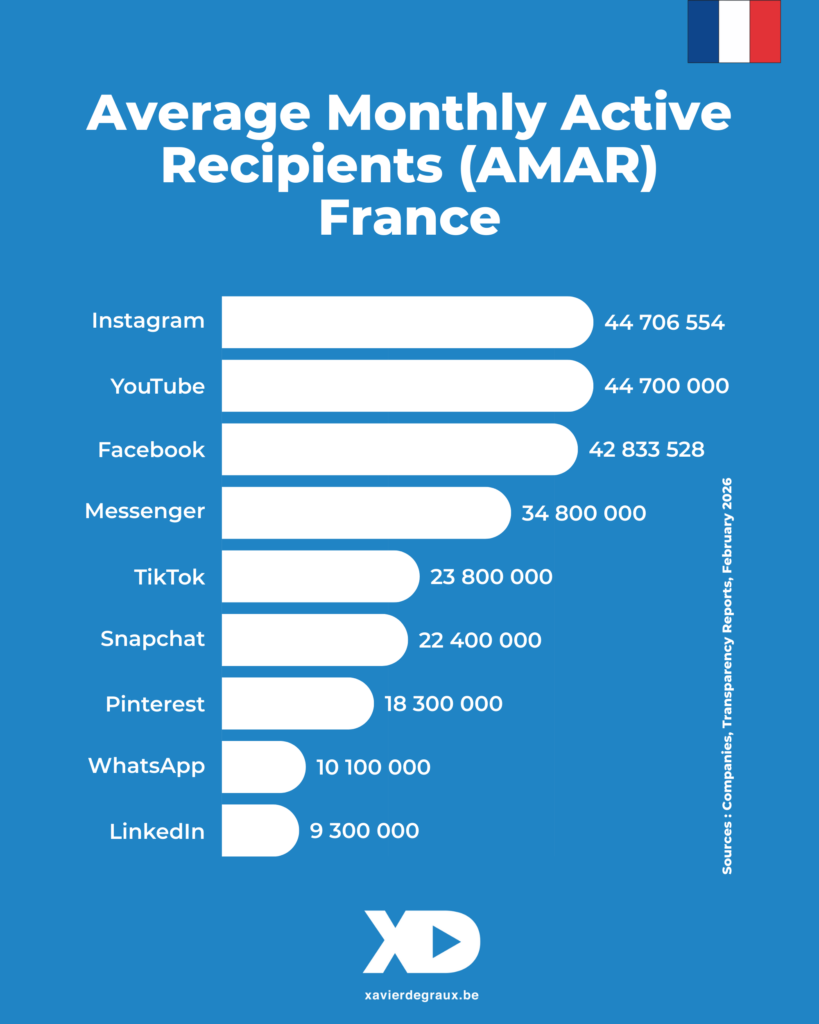 Dans l’hexagone, Instagram et YouTube sont au coude-à-coude, à 44,7 millions de récipiendaires actifs chaque mois. Soit 4,8 fois plus que LinkedIn.