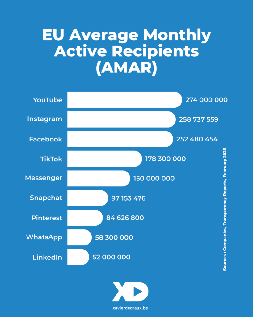 Ainsi sur les 450,3 millions d’Européens recensés au 14 octobre 2025 (selon Eurostat), YouTube, bien devant Instagram et Facebook, en a touché 274 millions, en moyenne, chaque mois, entre le 1er juillet et le 31 décembre décembre 2025. Soit 5,3 fois plus que LinkedIn.