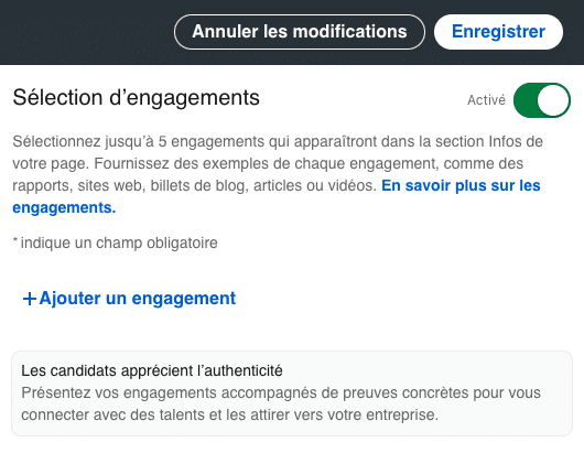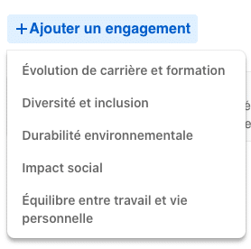 Accessible aux administrateurs des pages via le bouton bleu « Modifier la page », la nouvelle section « Nos engagements » (toutes les nouveautés 2022) permet aux entreprises de se positionner sur 5 types d’engagement.