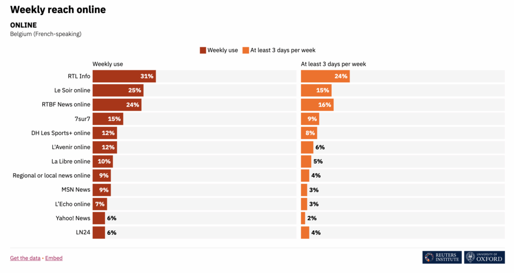 En ligne, le site d’information de RTL Belgium reste le plus plébiscité par les Belges francophones. Il a même repris 2 points de pourcentage en usage hebdomadaire, à 31%.