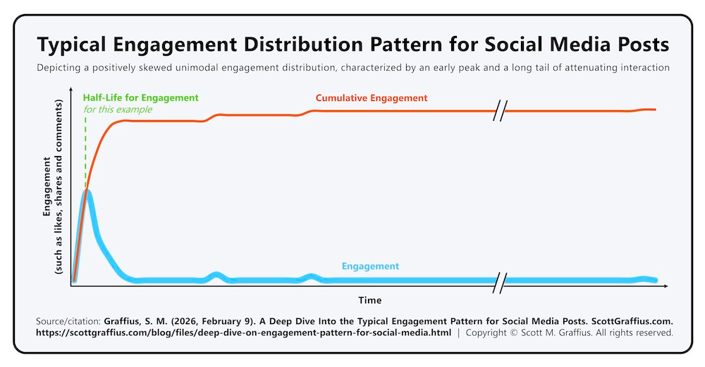 Avec une demi-vie de 23,22 heures, LinkedIn reste le terrain de jeu privilégié du B2B. Mais ne vous y trompez pas. L’engagement est ce qu’on appelle « unimodal à asymétrie positive ». Traduction : la majorité de vos likes et commentaires arrive bien avant que la moitié de la durée de vie du post ne soit écoulée.