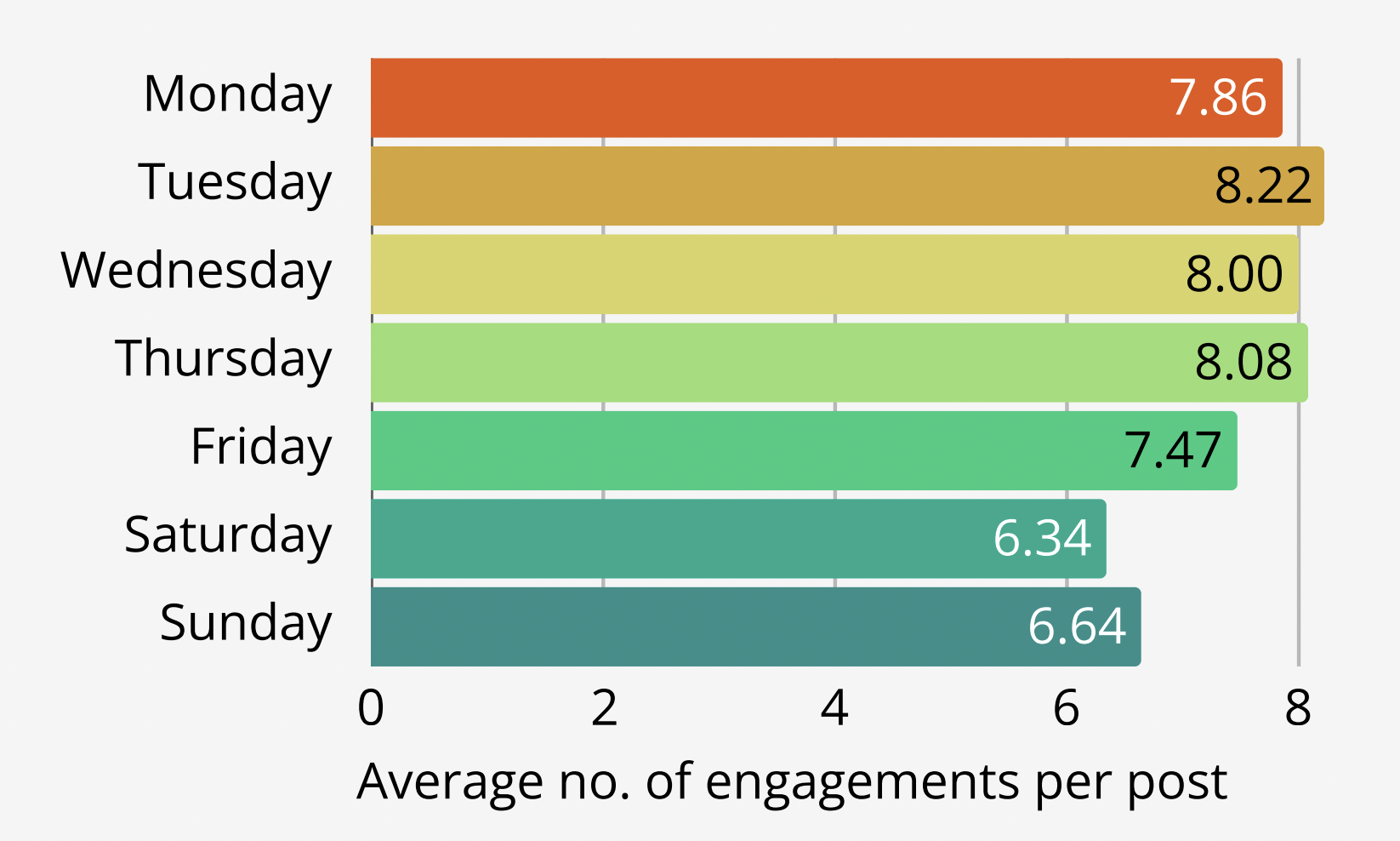 La majorité des publications analysées par DSMN8 ont lieu en semaine, avec un pic du mercredi au vendredi, mais l’engagement maximal se produit plutôt le mardi et le jeudi.