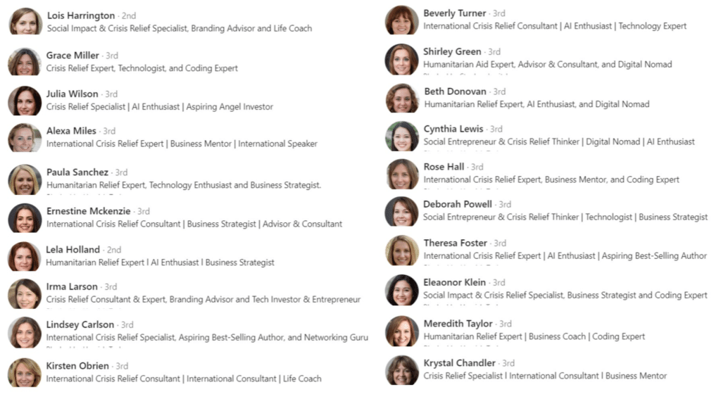 - Taux de remplissage faible du profil : pas de photo de profil (ou photo de type « mannequin »), pas de photo de couverture, pas ou peu d’infos en titre (avec un taux élevé de généreux recruteurs…), pas d’épingles visuelles, pas de liens, pas d’expériences mentionnées, pas de compétences… Mais attention, il arrive de plus en plus que les photos de profil soient volées ou générées par intelligence artificielle (deepfakes), et que les titres de profil soient copiés-collés depuis de vrais profils.