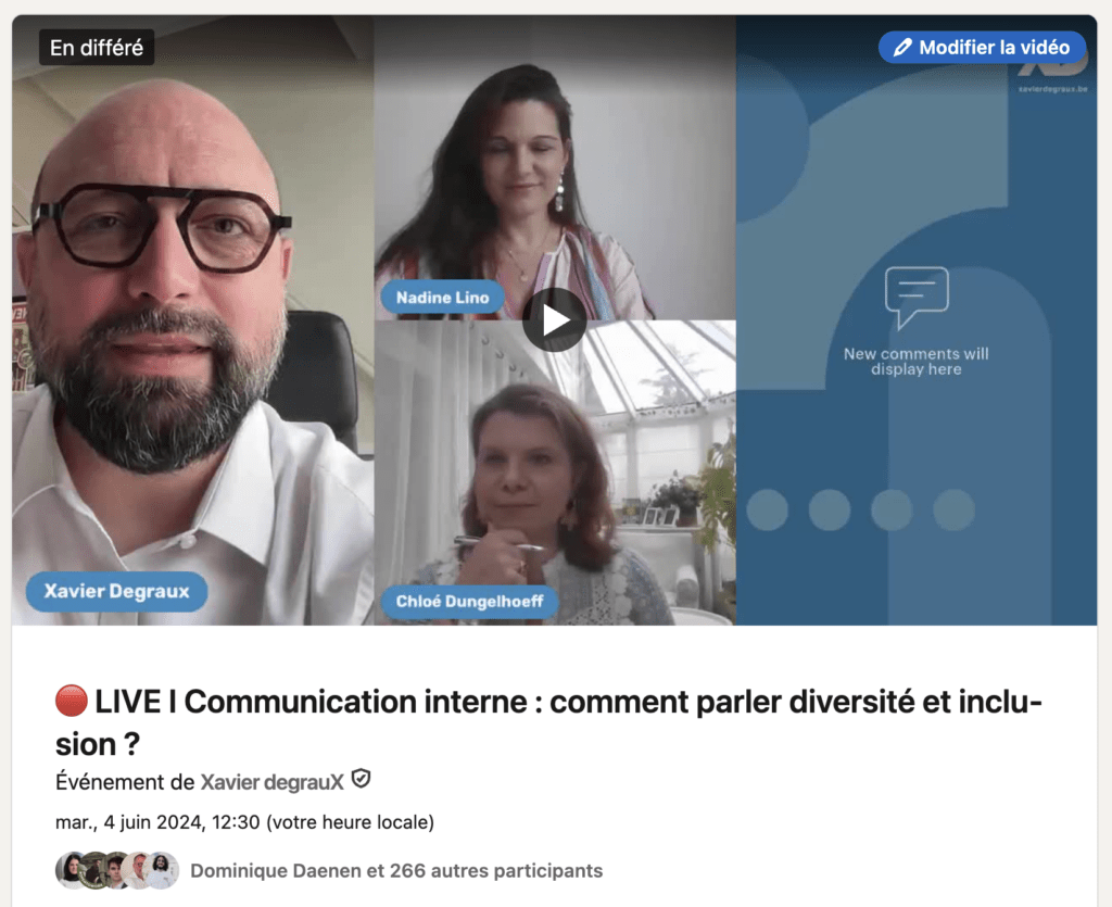 Invités en direct : jusqu’à 4 invités peuvent être ajoutés via un lien d’invité LinkedIn Live.