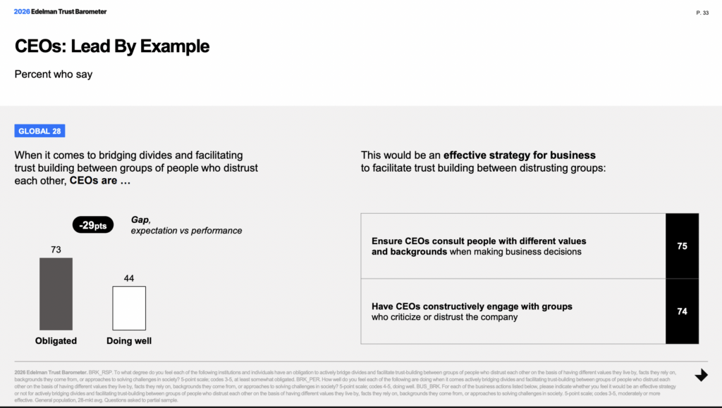 L’obligation est inscrite dans les attentes du public. 75% des employés estiment que leur employeur doit activement jeter des ponts entre les groupes qui se méfient les uns des autres. Pour les CEO, la pression est identique. 73% des répondants considèrent que le patron a l’obligation personnelle de réduire les clivages.