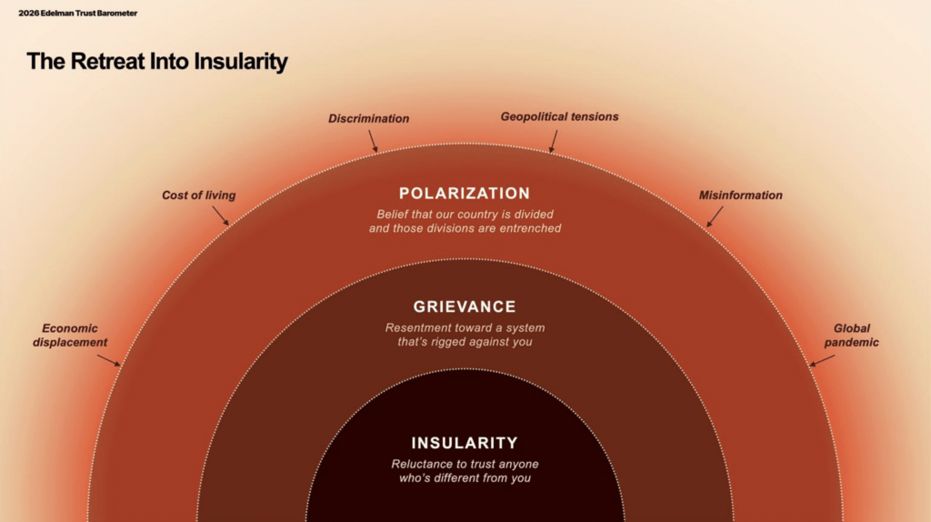 Le constat du rapport Edelman 2026 est sans appel : 7 personnes sur 10 s’enferment aujourd’hui dans une bulle. On appelle ça l’insularité. En fait, les gens refusent de faire confiance à celle ou celui qui possède des valeurs divergentes ou une culture différente. La peur domine les échanges. On reste entre soi. On se protège du voisin. Un désastre pour la cohésion.