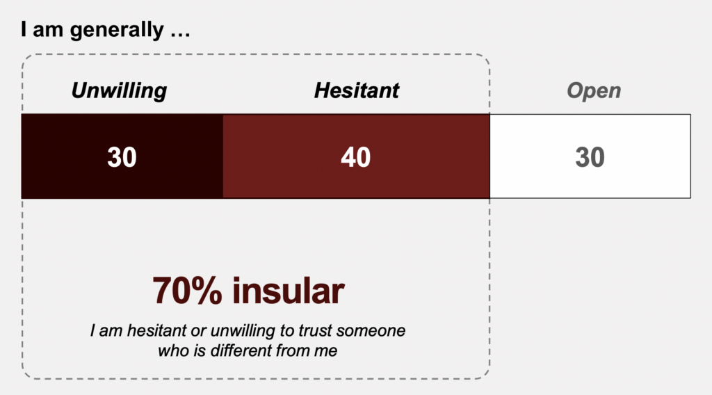 Quelque 7 personnes sur 10 sont hésitantes ou refusent de faire confiance à quelqu’un qui ne leur ressemble pas. Cette méfiance vise ceux qui vivent selon des principes différents ou croient en d’autres sources d’information. La peur de l’autre grippe tout. Le moteur social est cassé.