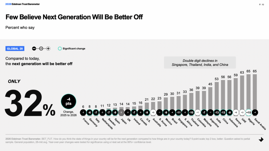 Seulement 32 % des citoyens croient encore que la prochaine génération vivra mieux que la nôtre. C’est un record de pessimisme. Or un collaborateur qui ne croit plus en l’avenir ne s’investit plus dans votre vision… C’est presque mathématique.