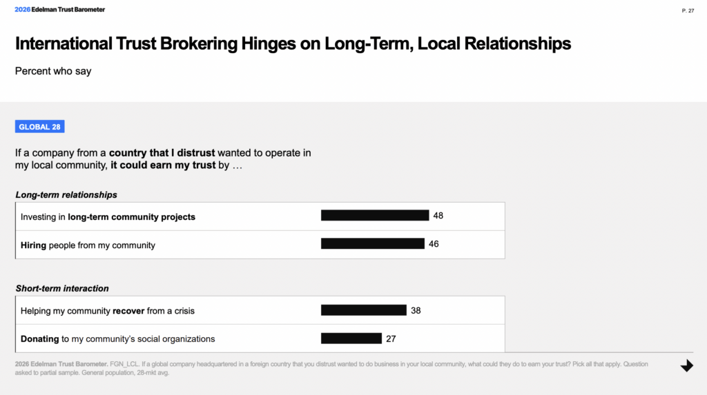 Le rapport insiste sur l’évolution vers un modèle polynational. Cela implique d’investir dans des relations locales à long terme. 48% des répondants estiment qu’une entreprise étrangère gagne leur confiance en finançant des projets locaux durables. L’embauche locale est aussi un critère majeur pour 46% des sondés.