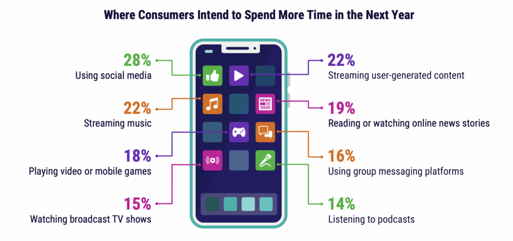 Et la tendance ne faiblit pas : au niveau mondial, 28% des utilisateurs déclarent qu’ils comptent passer encore plus de temps sur les réseaux sociaux dans l’année à venir.