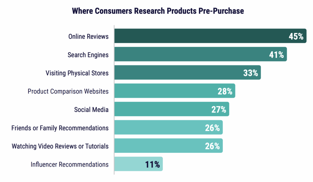 Avant d’acheter, 27% des consommateurs incluent déjà les réseaux sociaux parmi leurs trois principales sources de recherche produit, et 26% s’appuient sur des vidéos de tests et de tutoriels, notamment sur YouTube et les plateformes vidéo.