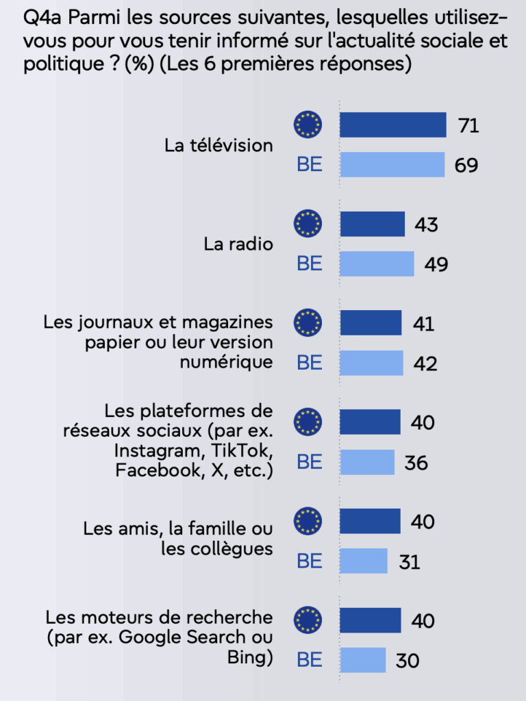 Dans l’ensemble, la télévision reste la première source d’information : 69% des Belges l’utilisent, contre 71% dans l’UE. La radio, en revanche, reste un pilier belge : 49%, soit six points de plus que la moyenne européenne. En matière de numérique, le pays se montre plus prudent : 30% des Belges consultent les moteurs de recherche pour s’informer (40% en UE) et 36% utilisent les réseaux sociaux (40% UE).