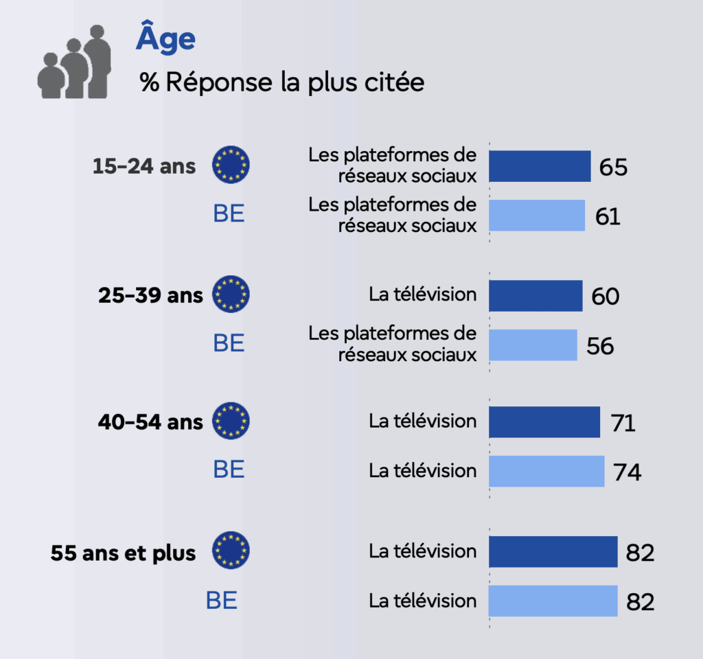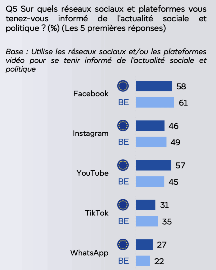 En 2025, le trio belge des plateformes d’information se compose de Facebook (61%), Instagram (49%) et YouTube (45%). Mais là encore, la Belgique se distingue : YouTube pèse beaucoup moins qu’à l’échelle européenne (57% en UE), tandis que TikTok gagne dix points en deux ans (35% en 2025 contre 23% en 2023).