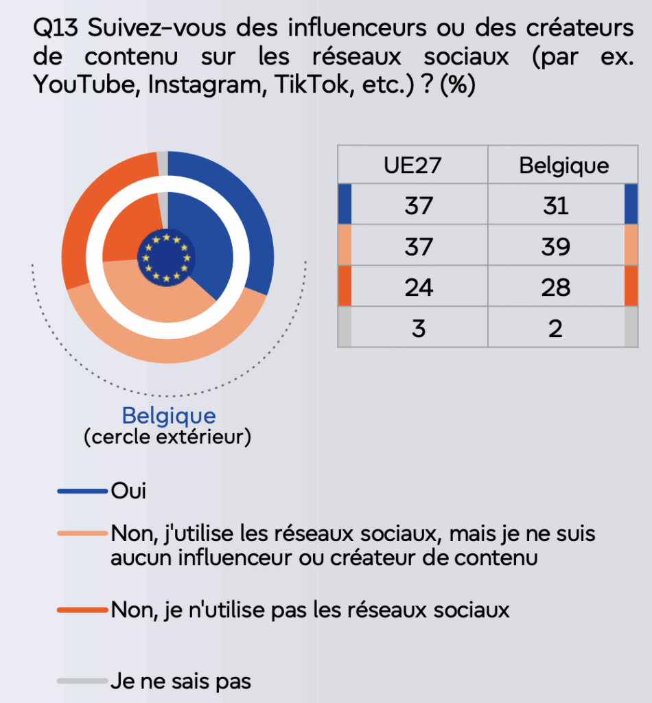 L’Eurobaromètre 2025 confirme l’ancrage des créateurs de contenu dans le paysage informationnel belge. 31% des Belges suivent au moins un influenceur ou créateur (contre 37% dans l’UE). Mais chez les 15-24 ans, le chiffre grimpe à 73%, exactement au niveau européen. En 2023, ils n’étaient que 63% : une hausse de dix points en deux ans.