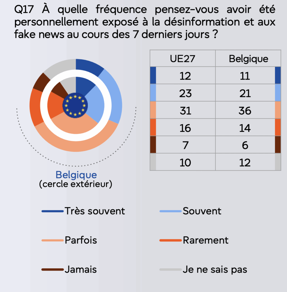 La proportion de Belges estimant avoir été exposés à de la désinformation reste stable : 68% déclarent y être confrontés au moins “parfois”, proche de la moyenne européenne (66%). En revanche, la perception d’une exposition “fréquente” reste un peu plus basse (21% contre 23% UE). En 2023, seuls 14% des Belges se disaient “souvent exposés”.