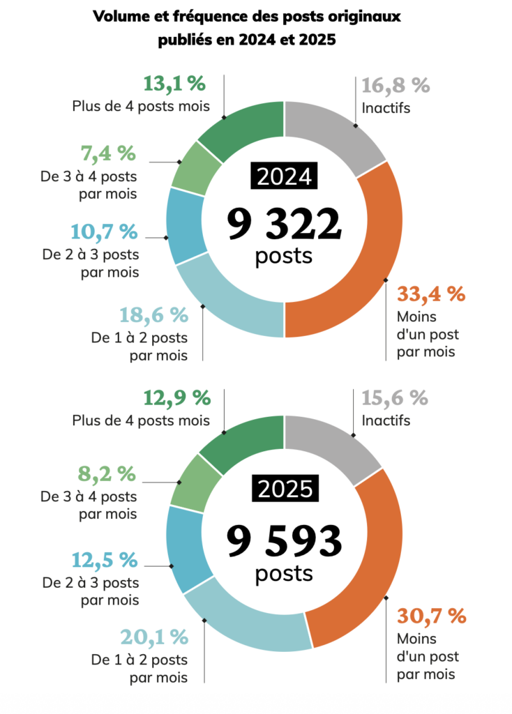 16,8% sont inactifs sur LinkedIn et « près d’un tiers des dirigeants du CAC 40 (30,7 %) publie toujours moins d’un post par mois en moyenne », chiffrent les auteurs de cette étude. Qui précisent que la part de ces dirigeants discrets a baissé d’à peine 3 points en 2025. Et que 33,6% des membres de Comex du CAC 40 parviennent à poster deux fois par mois.