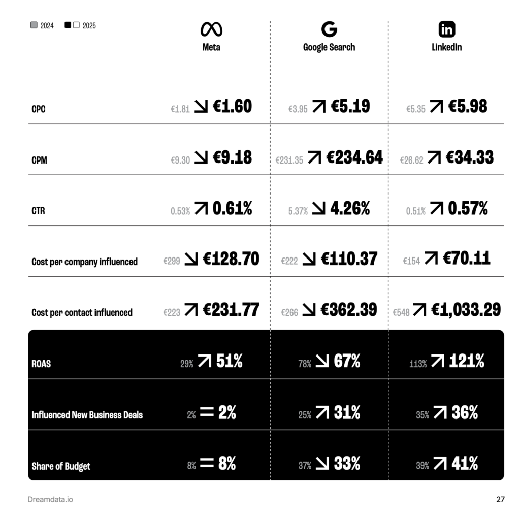 Pourtant, d’après dreamdata.io, malgré ce coût facial élevé, LinkedIn affiche le meilleur ROAS (Retour sur investissement publicitaire) du marché B2B avec 121%, surpassant largement Google Search (67%) ou Facebook (79%).