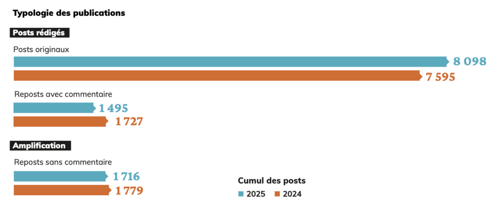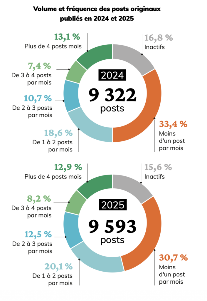 L’activité globale est en hausse également, avec 9.593 posts rédigés en un an, contre 9.322 en 2024. Mieux encore, la part des dirigeants publiant au moins deux fois par mois a bondi de 28,1% à 33,6%.
