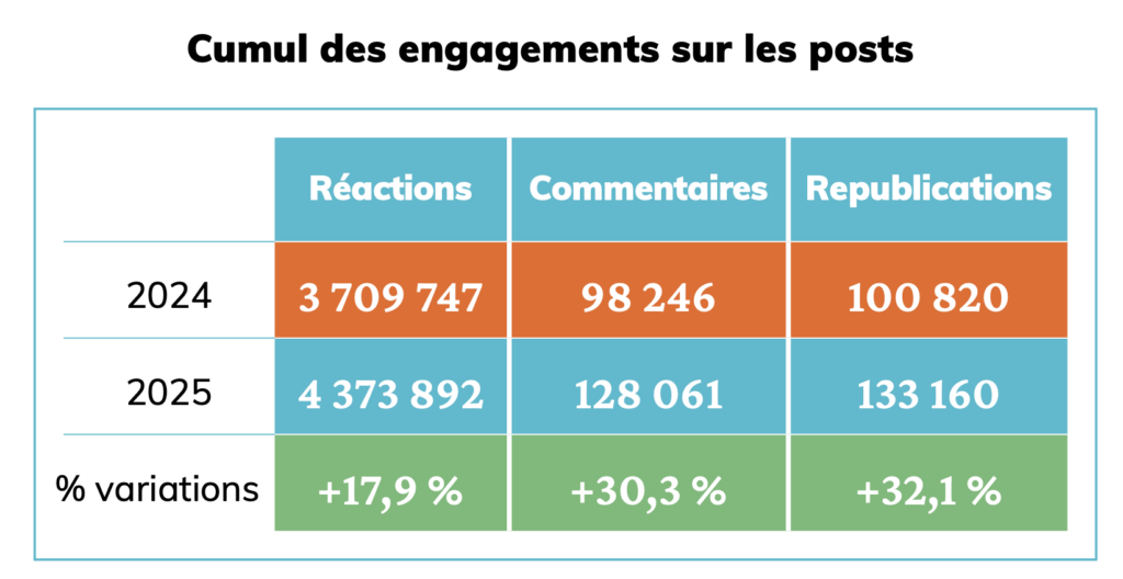 Quant à l’engagement global, il explose littéralement avec une hausse de 18,6% des interactions totales, portée par un boom des commentaires (+30,4%) et des republications (+32,1%).
