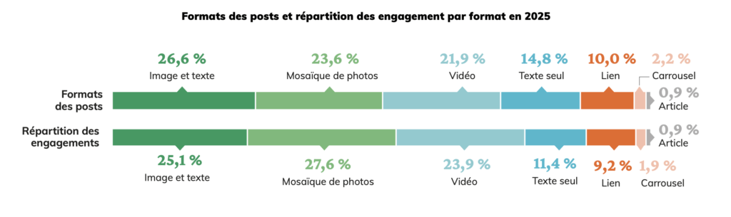 De même, l’usage de la vidéo incarnée (face caméra) est devenu une figure imposée pour donner de la chair aux annonces. À l’inverse, le format « texte seul » continue sa décrue (-7 points), tout comme les liens (-5 points), car les leaders ont compris que l’algorithme valorise l’image et l’incarnation.