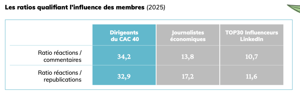 En moyenne, un post de dirigeant reçoit un commentaire toutes les 34,2 réactions (contre 38,3 en 2024). C’est trois fois moins que les journalistes économiques (13,8) ou les influenceurs de la plateforme (10,7).
