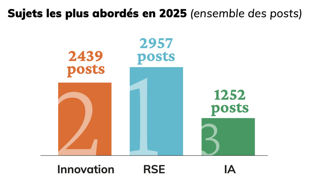 Sur le podium des sujets abordés, on trouve la RSE (2.957 posts), l’innovation (2.439 posts) et l’IA (1.252 posts). Pourtant, les sujets qui « fâchent », comme l’inflation ou les droits de douane de Trump par exemple, sont quasiment ignorés, déplorent les auteurs de l’étude de Story Jungle.