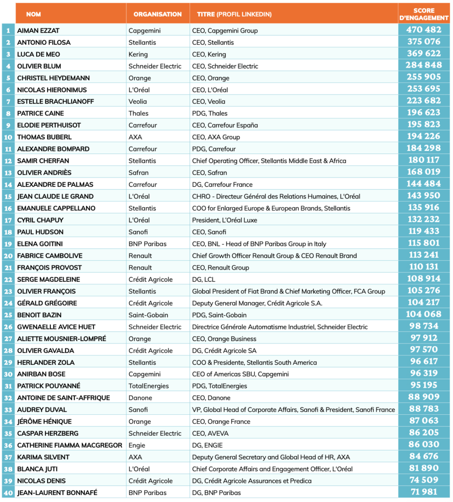 Karima Silvent (DRH, AXA) ou Blanca Juti (Dircom, L’Oréal) parviennent également à se hisser dans le Top 40 global, prouvant qu’une stratégie sectorisée est redoutable.
