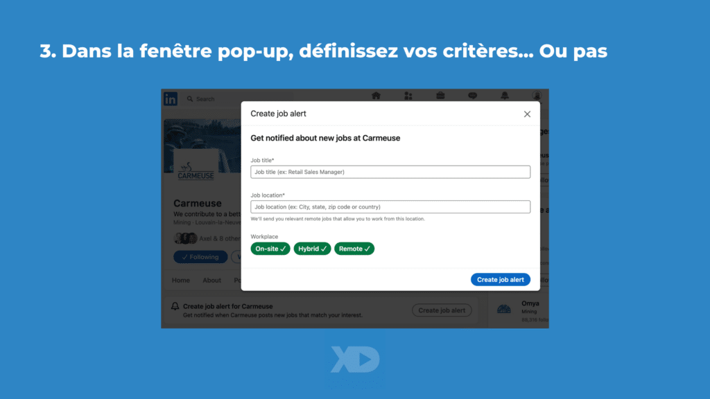 3. Dans la fenêtre pop-up, définissez vos critères… Ou pas (pour être alerté.e de toutes les offres)