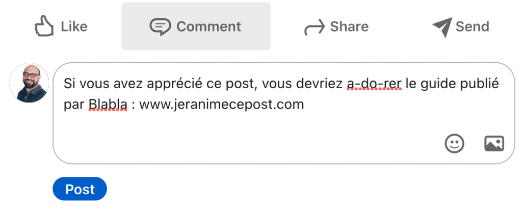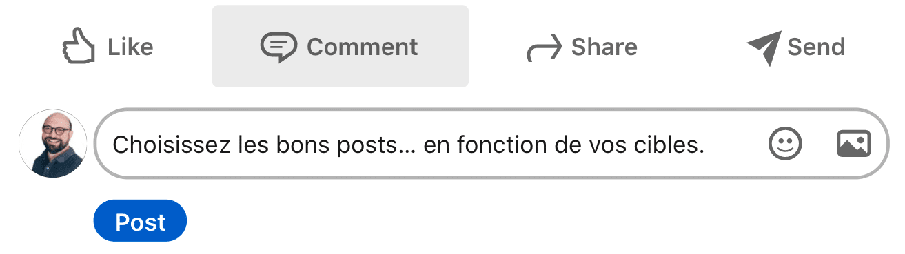 Pour le dire autrement : en quelques phrases argumentées, expliquez pourquoi vous avez apprécié le post, mais démontrez surtout votre expertise, votre valeur ajoutée. En ayant éventuellement recours à une référence, une expérience personnelle, des stats, une photo, un GIF, un émoji, un mème…