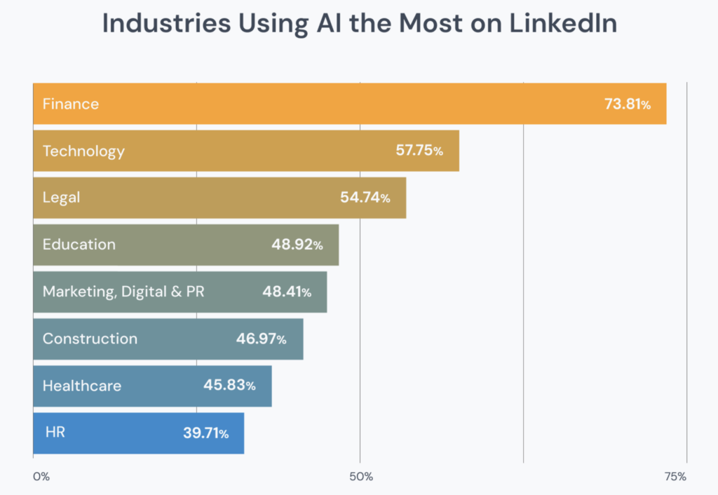 Dans le secteur de la finance, 73,8% des publications portent la marque de l’IA. La tech suit avec 57,8% et le juridique ferme ce podium de l’automatisation avec 54,7%.