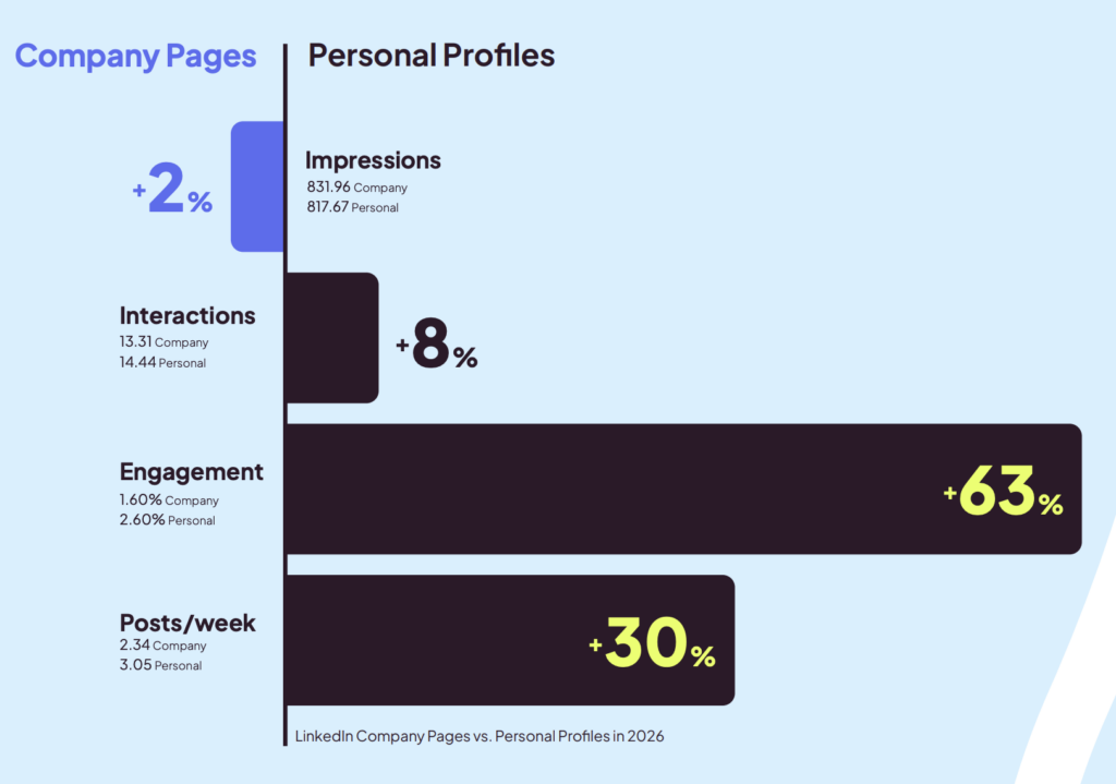 Bien que les pages entreprises parviennent encore à générer un volume d’affichage légèrement supérieur (+2%), elles peinent à convertir cette visibilité en action. Le profil personnel reste le roi incontesté de l’engagement, avec une efficacité supérieure de 63%.