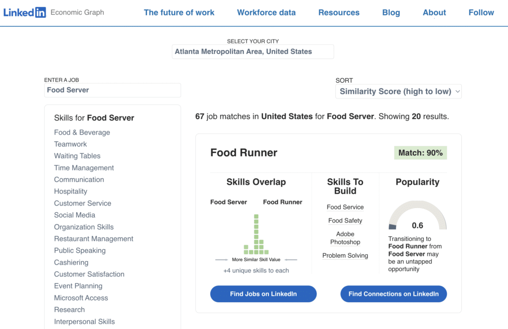 Mais ce n’est pas tout. Au centre, en plus d’une correspondance avec tel ou tel autre métier (testez les filtres de popularité et de similarité), vous trouverez 3 infos :
