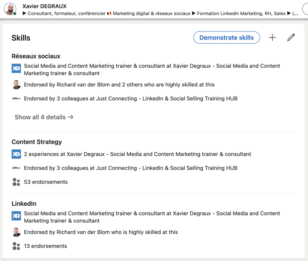 Reste à savoir quelles compétences choisir… Et lesquelles épingler parmi les 50 possibles et soumises de facto aux votes de vos relations de premier niveau.