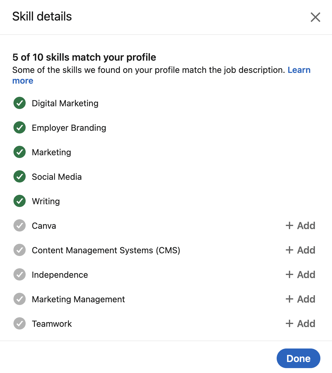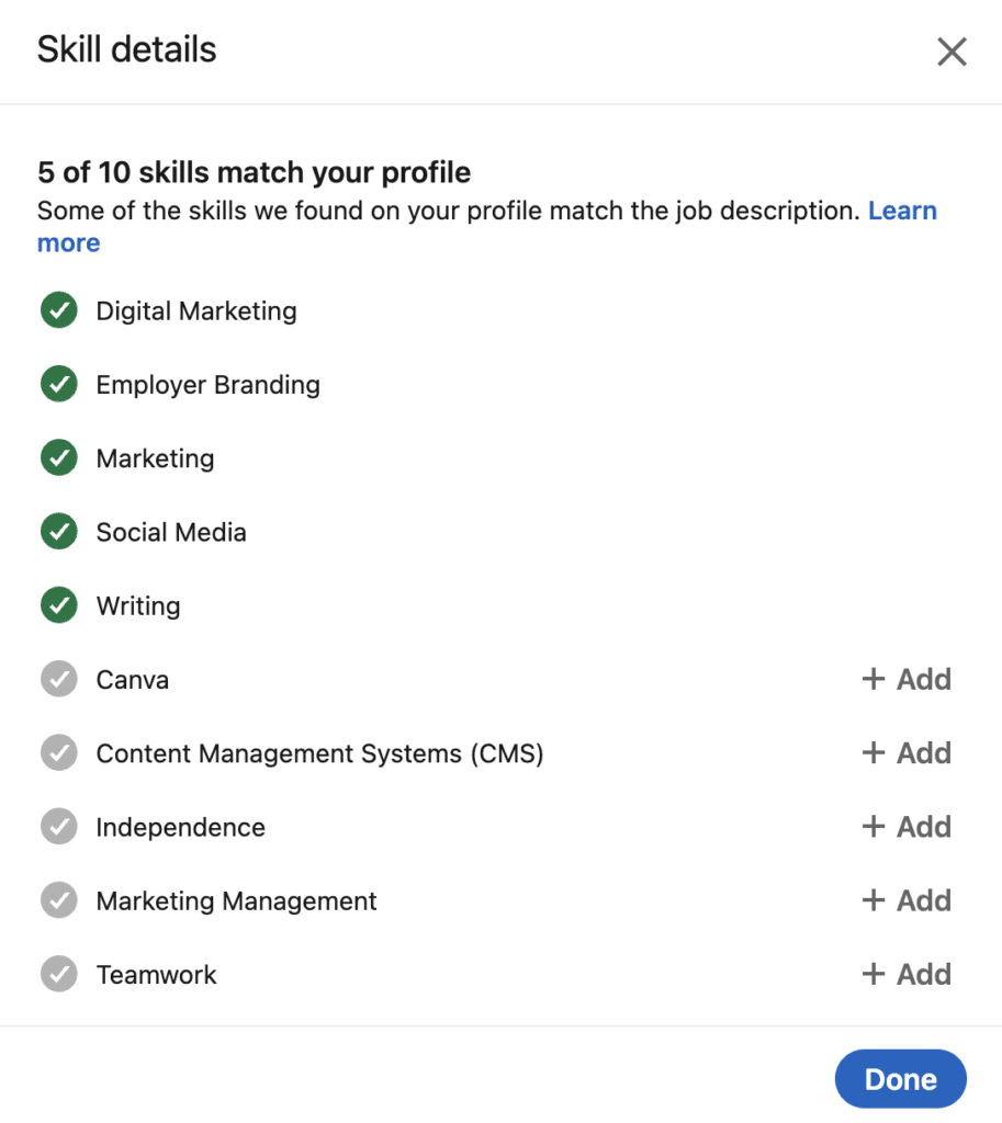 - Ajoutez au moins 3 compétences à votre « Expérience » en cours