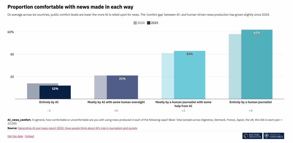 Ce déficit perçu de supervision explique une défiance durable : l’IA est jugée utile, mais rarement fiable lorsqu’elle touche au cœur du métier journalistique.