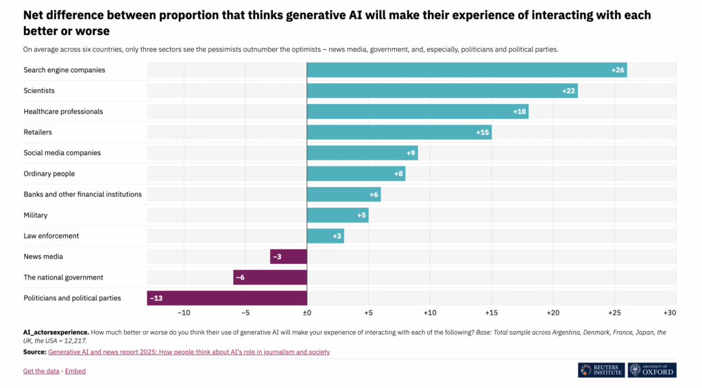 Selon l’étude du Reuters Institute, la plupart des sondés pensent que l’IA va améliorer leur relation avec les médias d’information, alors qu’elle devrait améliorer leur rapport aux moteurs de recherche, aux scientifiques… et même aux réseaux sociaux.