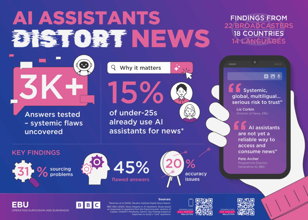Une étude conjointe de la BBC et de l’EBU (dont la RTBF fait partie) montre que 45% des réponses produites par les assistants d’IA à propos de l’actualité contiennent une erreur importante. Un rapport du Reuters Institute et un autre de l’UE pointent quant à eux une adoption rapide de l’IA générative, y compris comme pour s’informer. Même si la méfiance est là…