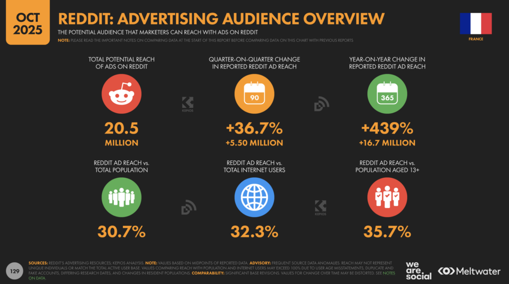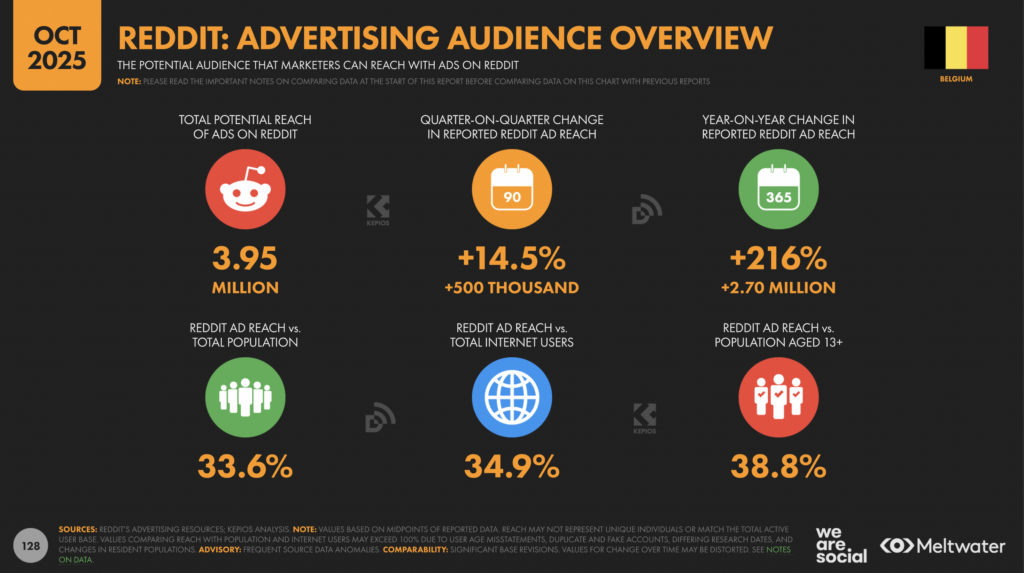 En Belgique, où je vis, le dernier rapport du Centre d’Information sur les Médias (CIM), qui remonte à octobre 2025, est sans appel : Reddit reste un nain, avec une audience de 31 ans de moyenne d’âge, massivement masculine (76% d’hommes). À peine 5,6% d’usage mensuel. On gagne un petit point en un an, mais on part de très bas. Le plus frappant reste le fossé linguistique. Chez les francophones, on tombe à 3,8%. En gros, à Namur ou à Liège, personne n’y est. Côté néerlandophone, c’est le double. Pire : l’intensité d’usage quotidien baisse de 2% sur la même période.