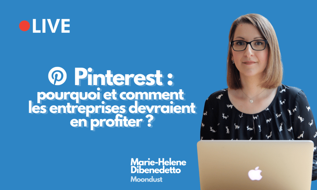 (Re)vivez le « 🔴 LIVE I Pinterest : pourquoi et comment les entreprises devraient en profiter ? », avec Marie-Helene Dibenedetto (Moondust), l’une de ses meilleures expertes belges.