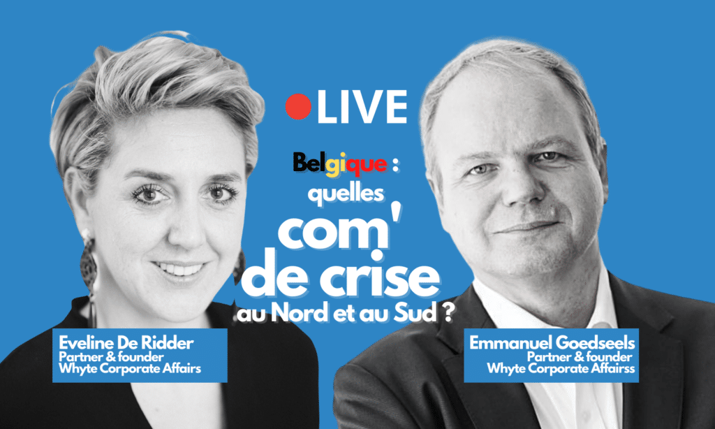 (Re)vivez le « 🔴 LIVE I Belgique : quelles communications de crise au Nord et au Sud ? » avec Eveline De Ridder et Emmanuel Goedseels, fondateurs et partenaires de Whyte Corporate Affairs, à propos de #CommunicationDeCrise… à la sauce belge.