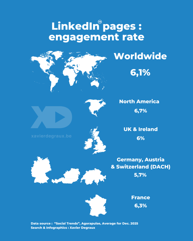 En décembre 2025, le taux d’engagement des publications de pages LinkedIn s’est élevé à 6,1%, en moyenne, dans le monde, tous secteurs confondus. Un peu plus haut en Amérique du Nord, ou en France, comme le montre cette infographie maison.