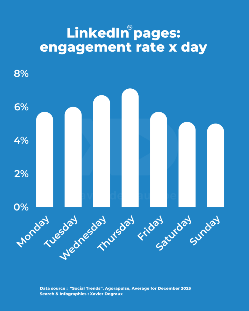 Entre le jour le plus engageant (jeudi, avec 7,1%) et le jour le moins engageant (dimanche, avec 5%), il y a un écart de 2,1 points de pourcentage, et non plus d’1,6 points comme nous l’avions noté en juillet 2025.