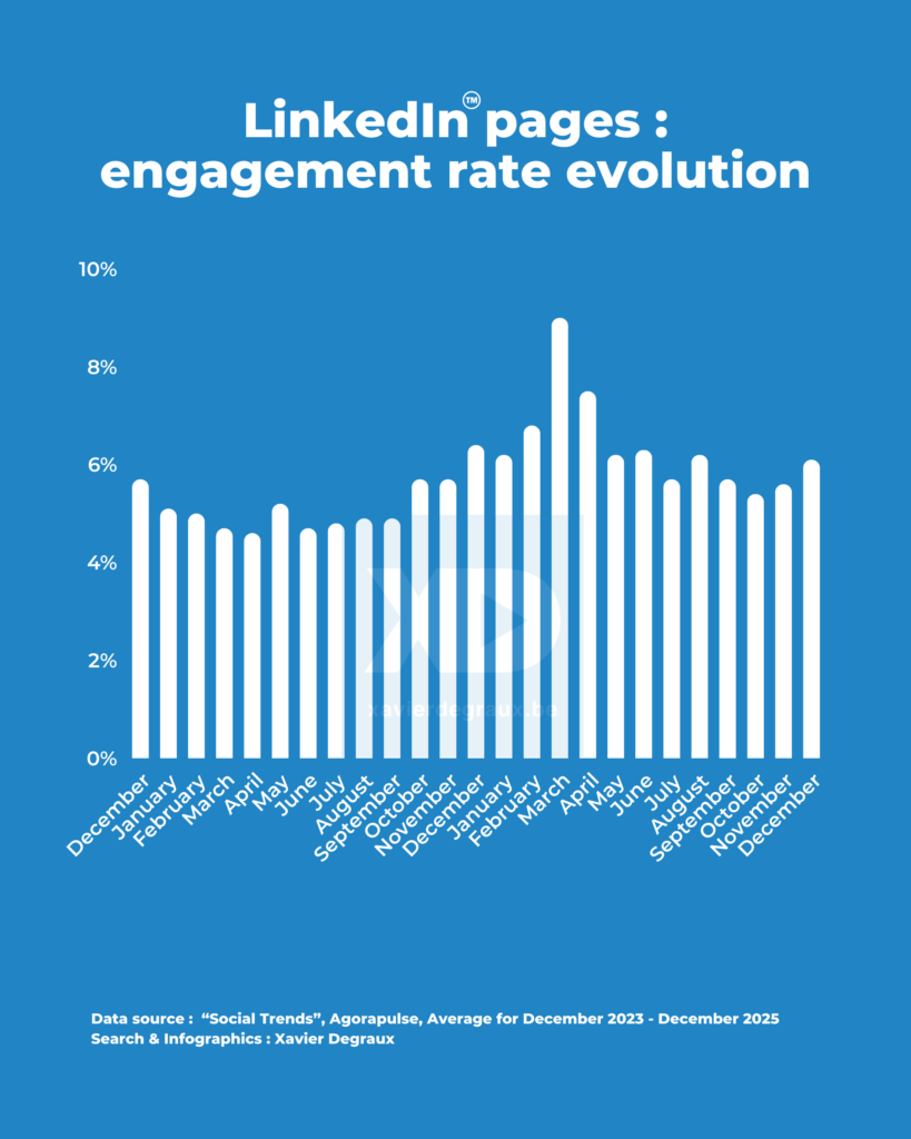 Comparé à décembre 2024, le taux d’engagement moyen sur LinkedIn est léger recul, de 0,3 point. En revanche, il n’avait plus été aussi élevé depuis août dernier.