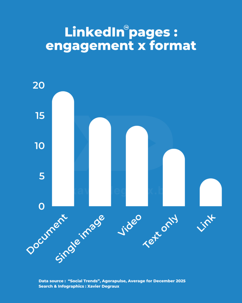 Autre constat : en décembre 2025, c’est toujours le format Document (aka « Carrousel » ou « PDF ») qui a récolté, en moyenne, le plus d’engagements par post.