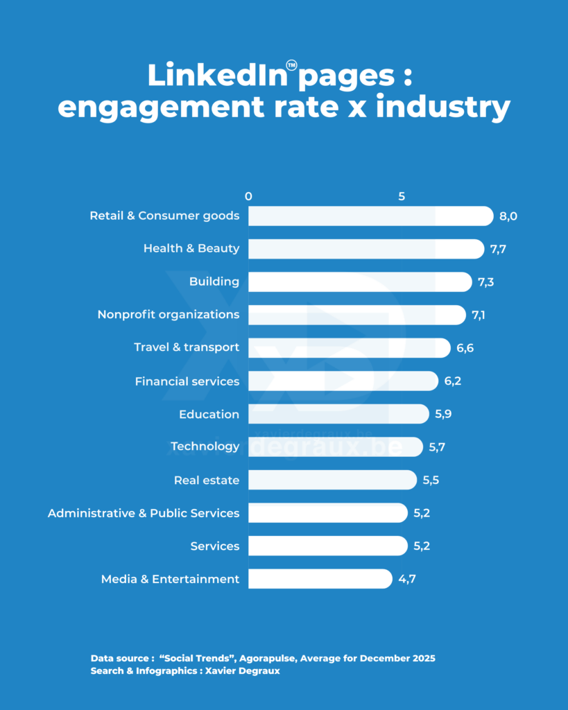 En décembre 2025, le taux d’engagement des publications de pages LinkedIn s’est élevé à 6,1%, en moyenne, dans le monde, tous secteurs confondus. Un peu plus haut en Amérique du Nord, ou en France, comme le montre cette infographie maison.