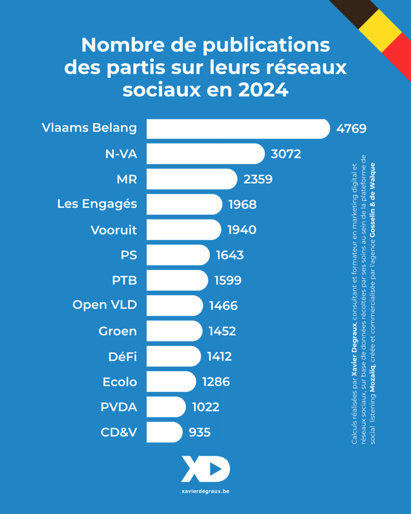 - Cette analyse, qui porte sur 2024, année doublement électorale, révèle la volonté de domination de Georges-Louis Bouchez (MR) : tous réseaux confondus, le président du MR a publié 4.409 posts, soit 85% de plus que Tom Van Grieken, le président du Vlaams Belang, 2ème du classement. Et Georges-Louis Bouchez a « incarné » son parti comme aucun de ses concurrents.