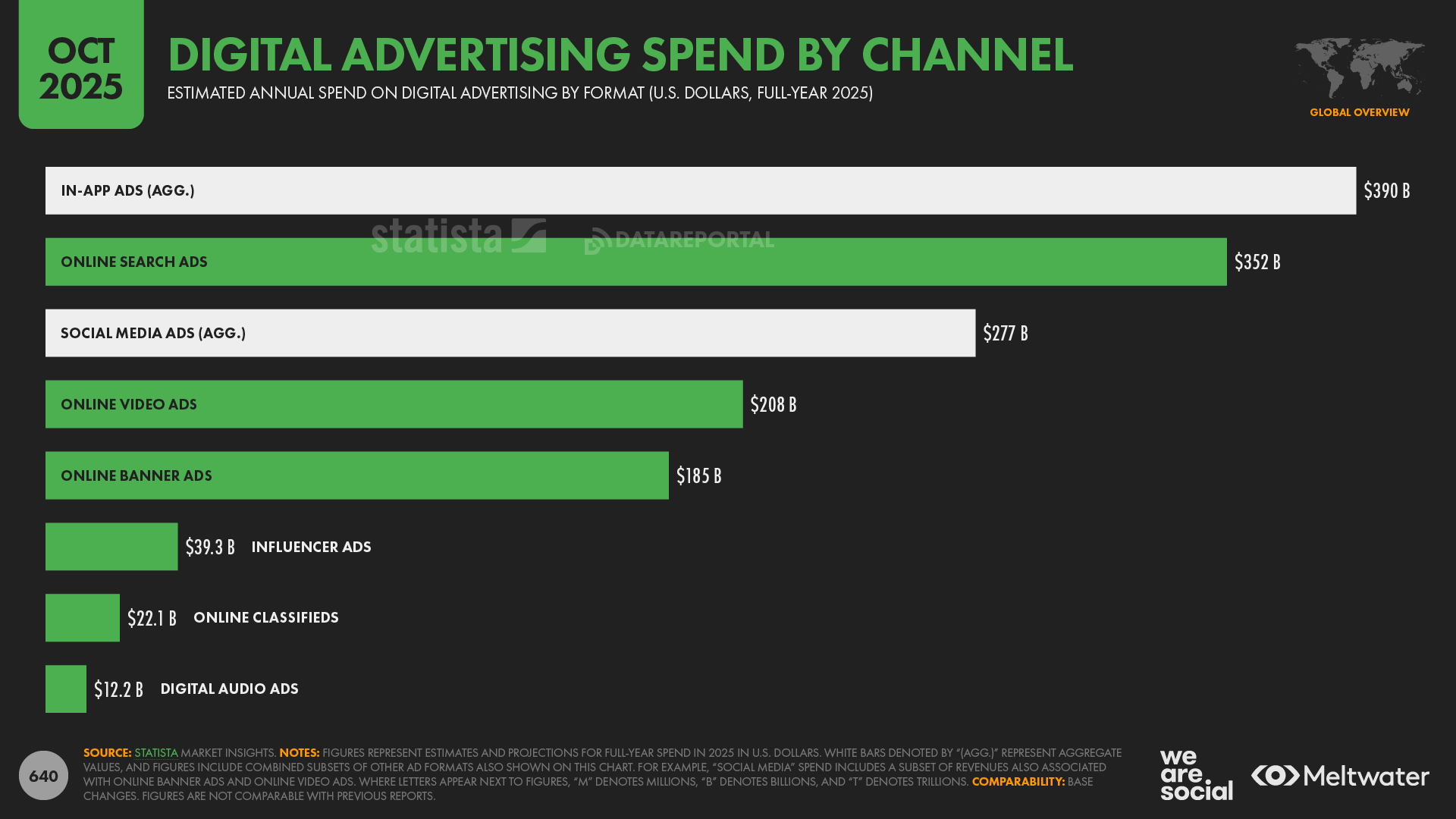 - La baisse du reach organique n’est pas un accident : elle incite les marques à financer leur visibilité. Les plateformes vivent de l’achat d’attention. WARC évalue le marché social media à 306,4 milliards de dollars en 2025 (+14,9%), soit 26,2% de toutes les dépenses publicitaires mondiales. À lui seul, Meta devrait croître de 14,8% cette année et capter environ 60% de toutes les dépenses publicitaires sociales. De son côté, Statista projette 277 milliards de dollars sur l’ensemble de l’année (+13,6%), soit 32,1% du total des dépenses publicitaires numériques.